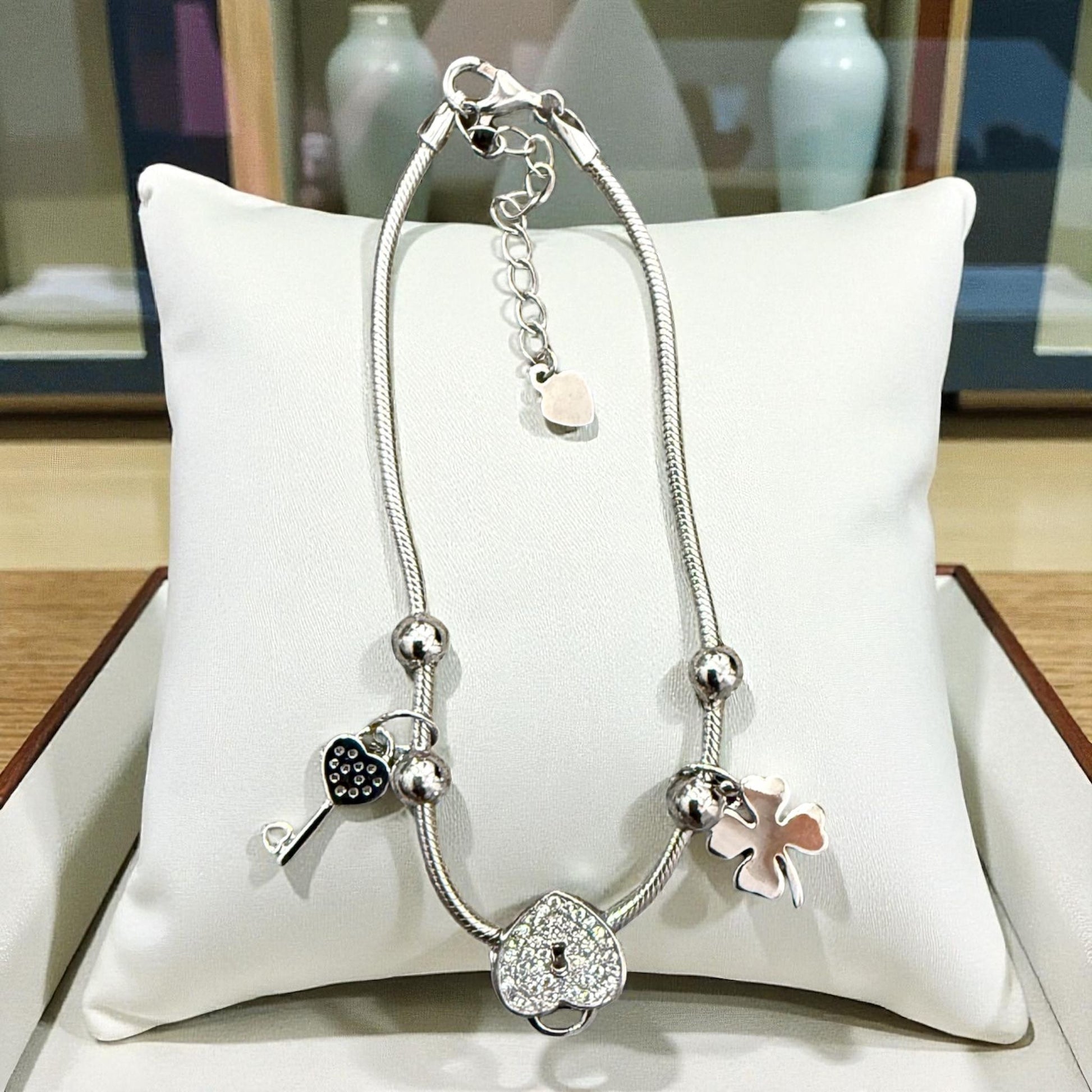 925 Sterling Silber Charm Armband – Herz, Glücksklee & Schlüssel – 9–10g – Geschenk für Sie